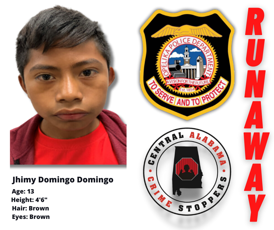 The Opelika Police Department is searching for a runaway juvenile, Jhimy Domingo Domingo, 13.